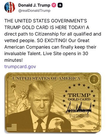 ‘ट्रंप गोल्ड कार्ड’ के लिए आवेदन प्रक्रिया शुरू : इस कार्ड को लॉन्च करते हुए अमेरिकी राष्ट्रपति ने दावा किया कि यह ग्रीन कार्ड जैसा है लेकिन इससे फायदा कहीं ज्यादा है। इससे आने वाला अरबों डॉलर अमेरिकी सरकार के खजाने में जाएगा। उन्होंने कहा कि यह हमारे देश में प्रतिभाशाली लोगों को लाने का मौका देगा। ‘ट्रंप गोल्ड कार्ड’ के लिए आवेदन प्रक्रिया शुरू हो गई है। इसकी आधिकारिक वेबसाइट पर इच्छुक लोग आवेदन कर सकते हैं। ट्रंप गोल्ड कार्ड पाने के लिए व्यक्तिगत आवेदकों को 10 लाख डॉलर (1 मिलियन डॉलर) देना होगा। भारतीय करेंसी में इसका मूल्य करीब 9 करोड़ रुपये है, जबकि कंपनियों द्वारा प्रायोजित आवेदकों के लिए यह राशि 20 लाख डॉलर है, जिसकी भारतीय करेंसी में मूल्य करीब 18 करोड़ रुपये है। इसके साथ 15,000 डॉलर की नॉन-रिफंडेबल प्रोसेसिंग फीस भी देनी होगी।
