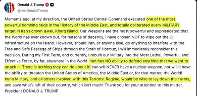 ट्रंप के अनुसार यह हमला मध्य पूर्व के इतिहास के सबसे शक्तिशाली बमबारी अभियानों में से एक था। उन्होंने कहा कि अमेरिकी सेना ने खार्ग द्वीप पर मौजूद सभी सैन्य लक्ष्यों को निशाना बनाया और उन्हें पूरी तरह नष्ट कर दिया। उन्होंने सोशल मीडिया पर इससे जुड़ा एक वीडियो भी साझा किया है। ट्रंप ने चेतावनी देते हुए कहा कि यदि ईरान या कोई अन्य देश होर्मुज जलडमरूमध्य से गुजरने वाले जहाजों की सुरक्षित आवाजाही में बाधा डालता है तो अमेरिका अपना फैसला बदल सकता है। उन्होंने कहा कि ऐसी स्थिति में अमेरिका द्वीप के तेल ढांचे को भी निशाना बनाने पर विचार करेगा। अमेरिका के खर्ग द्वीप पर हमले पर ईरान ने पलटवार की धमकी दी है। समाचार समूह ईरान इंटरनेशनल ने ईरान के खतम अल-अनबिया केंद्रीय मुख्यालय के एक प्रवक्ता के हवाले से कहा है कि ईरान अपने तेल, आर्थिक और ऊर्जा संपत्तियों पर हमलों का तुरंत जवाब देगा, जिसमें अमेरिका से जुड़े क्षेत्रीय बुनियादी ढांचे को निशाना बनाया जाएगा। खार्ग द्वीप ईरान के लिए रणनीतिक रूप से बेहद महत्वपूर्ण और बड़ा तेल निर्यात केंद्र है। इसे ईरान की ऊर्जा व्यवस्था का प्रमुख केंद्र माना जाता है।