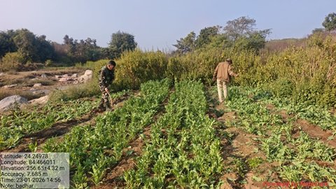 प्रतापपुर(चतरा): प्रतापपुर प्रक्षेत्र अंतर्गत अवैध अफीम की खेती के विरुद्ध वन विभाग द्वारा सख्त अभियान चलाया गया। वन क्षेत्र पदाधिकारी, प्रतापपुर प्रक्षेत्र के निर्देशानुसार शुक्रवार को अफीम विनष्टीकरण अभियान के तहत व्यापक कार्रवाई की गई।अभियान के दौरान डुमरवार पीएफ क्षेत्र में लगभग 3 एकड़ गैर वनभूमि तथा बधार पीएफ क्षेत्र में लगभग आधा एकड़ वनभूमि पर अवैध रूप से की जा रही अफीम(पोस्ता) की खेती को ट्रैक्टर-हल एवं मजदूरों की सहायता से पूर्णतः नष्ट किया गया। इस कार्रवाई से क्षेत्र में अवैध मादक पदार्थों की खेती करने वालों में हड़कंप मच गया है। इस संयुक्त अभियान में प्रतापपुर प्रक्षेत्र के वनकर्मी, कुन्दा थाना की पुलिस बल तथा एसएसबी के जवानों की सक्रिय एवं सराहनीय भूमिका रही। अभियान को पूरी सतर्कता और सुरक्षा के बीच अंजाम दिया गया।वन विभाग एवं प्रशासन ने स्पष्ट शब्दों में कहा है कि अवैध मादक पदार्थों की खेती किसी भी सूरत में बर्दाश्त नहीं की जाएगी, और भविष्य में भी इस प्रकार की सख्त कार्रवाई लगातार जारी रहेगी। साथ ही वन विभाग ने आम नागरिकों से अपील की है कि यदि कहीं भी अवैध अफीम या अन्य मादक फसलों की खेती की सूचना मिले तो तत्काल प्रशासन या वन विभाग को सूचित करें ताकि समय रहते प्रभावी कार्रवाई की जा सके।