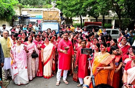 विसर्जन के दौरान कई श्रद्धालुओं की आंखें नम हो गईं : गुरुवार को आशियाना अनंतारा सोसाइटी के सदस्यों ने पारंपरिक रीति-रिवाजों के साथ मां दुर्गा की प्रतिमा का डीमना लेक में विसर्जन किया। विसर्जन से पहले महिलाओं ने सिंदूर खेला कार्यक्रम में भाग लेते हुए एक-दूसरे को सिंदूर लगाकर सुख, सौभाग्य और परिवार की समृद्धि की कामना की। इसके बाद सभी श्रद्धालु ‘अगले बरस तू जल्दी आ’ के उद्घोष के साथ मां की प्रतिमा को सोसाइटी से डिमना झील तक ले गए। ढोल-नगाड़ों और आतिशबाजी के बीच जब मां की प्रतिमा विसर्जन स्थल पहुंची, तो वातावरण भक्ति और भावनाओं से भर गया। विसर्जन के दौरान कई श्रद्धालुओं की आंखें नम हो गईं। मां की विदाई के बाद सोसाइटी परिसर में सभी ने सामूहिक रूप से प्रसाद ग्रहण किया और अगले वर्ष पुनः मां के आगमन की आशा जताई। आयोजन समिति के अध्यक्ष विकास सिंह ने बताया कि गुरुवार को मां और बेटी की विदाई करना शुभ नहीं माना जाता, इसलिए परंपरा के अनुसार शुक्रवार को विसर्जन किया गया। उन्होंने कहा कि मां दुर्गा के आशीर्वाद से हर वर्ष यह आयोजन अधिक भव्य होता जा रहा है। विसर्जन कार्यक्रम में बड़ी संख्या में श्रद्धालु उपस्थित रहे जिनमें निशा सिंह, सुनंदा कुमार, पुनम सिंह, रेनू सिंह, प्रतिभा मिश्रा, पूजा सिंह, दीपा सिंह, चंचल कुमारी, सीमा प्रसाद, मोटीसी पॉल, अंजू गुप्ता, शोभा राय, सोना सिंह, गायत्री महतो सहित सैकड़ों लोग शामिल थे।