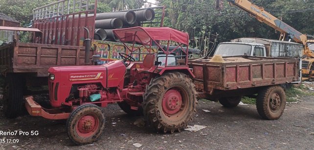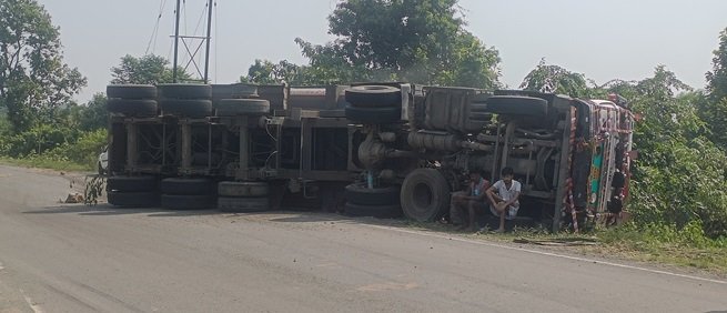 गिट्टी लदा ट्रेलर सड़क पर पलटा