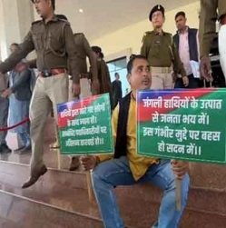 विधानसभा परिसर के बाहर मांडू विधायक ने हाथियों के हमले से मौत पर किया प्रदर्शन